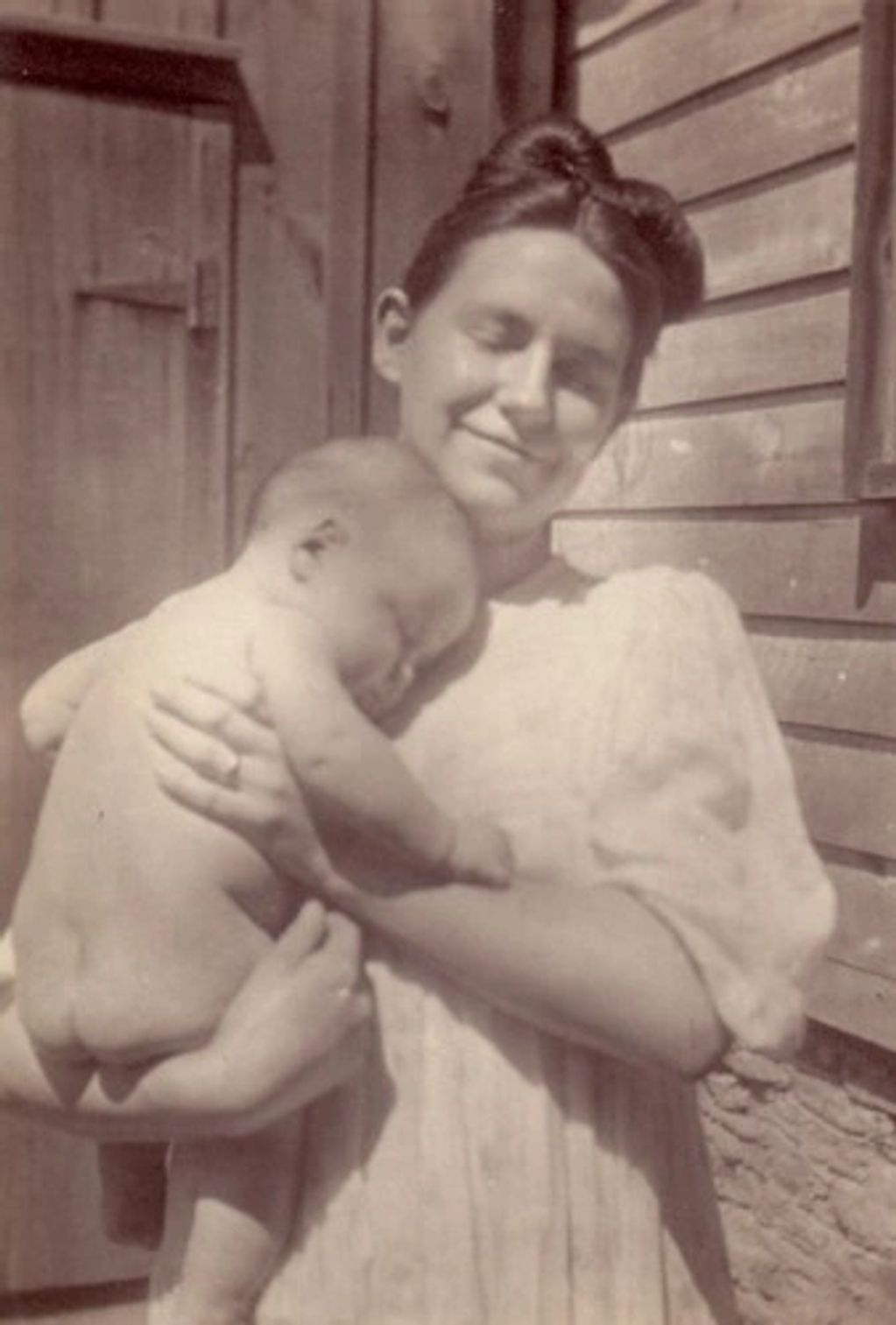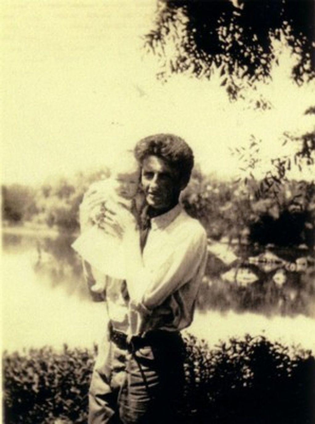 Carl Ahrens holding Penelope in their backyard in Meadowvale in 1908.